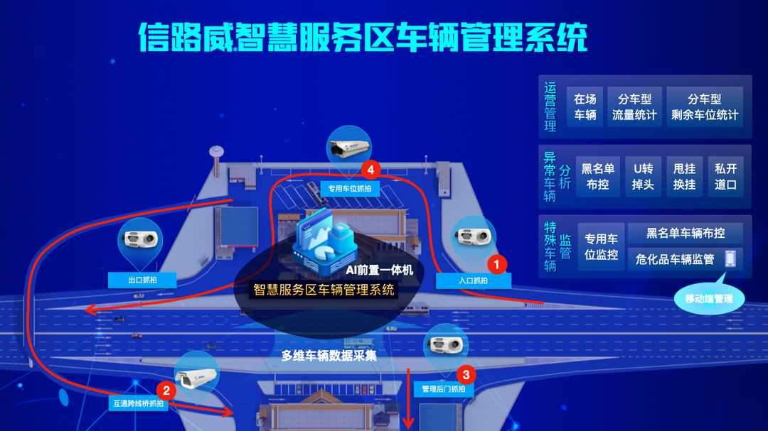 信路威智慧服務(wù)區(qū)車輛管理系統(tǒng),通過在服務(wù)區(qū)入出口匝道、內(nèi)部互通通道、專用車位等位置部署智能識別一體機(jī),實(shí)現(xiàn)對服務(wù)區(qū)所有通道的車流全覆蓋識別,精準(zhǔn)采集通行車輛的多維數(shù)據(jù);同時運(yùn)用公眾號/小程序等實(shí)現(xiàn)對危化品等車輛進(jìn)行無紙化管理;對異常車輛進(jìn)行分析處理,在服務(wù)區(qū)入出口抓拍,深挖貨車換掛、貨車換牌的違法行為,對在服務(wù)區(qū)內(nèi)的U轉(zhuǎn)行駛、私開道口等可疑逃費(fèi)行為進(jìn)行全景監(jiān)管,為高速收費(fèi)稽核提供服務(wù)區(qū)關(guān)鍵節(jié)點(diǎn)的輔助核查數(shù)據(jù)。