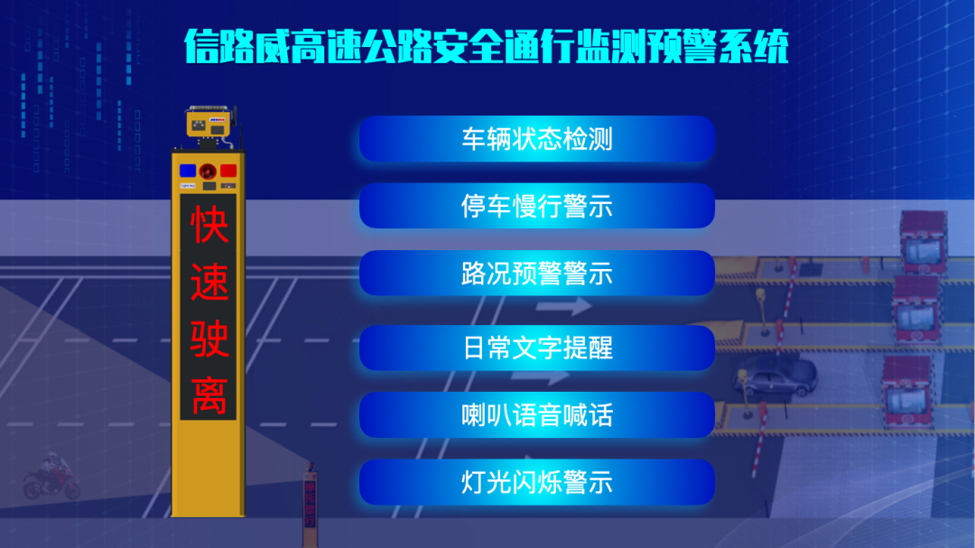信路威以AI賦能,助力高速公路安全通行,推出高速公路安全通行監(jiān)測預(yù)警系統(tǒng),在分流匝道路口、匯入匝道路口、隧道、下坡、彎道、雨雪霧等重點(diǎn)路段部署智能設(shè)備“高速哨兵”,可實(shí)現(xiàn)車輛狀態(tài)檢測、停車慢行警示、路況預(yù)警警示 、日常文字提醒、喇叭語音喊話、燈光閃爍警示等功能,降低了高速公路事故率和死亡率,為高速行車安全風(fēng)險(xiǎn)進(jìn)行預(yù)警和提醒。