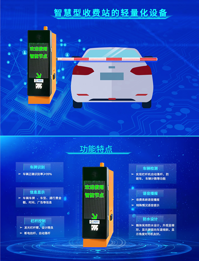 信路威高速一體化智能欄桿機(jī),集車(chē)牌識(shí)別設(shè)備、費(fèi)額顯示屏、高速欄桿機(jī)、車(chē)輛檢測(cè)器、通行信號(hào)燈、語(yǔ)音喇叭等多種車(chē)道設(shè)備于一體, 可根據(jù)需要選配車(chē)道控制器、智能節(jié)點(diǎn)主機(jī)、機(jī)柜空調(diào)、ETC 天線(xiàn)控制器等設(shè)備,集成化減少了對(duì)收費(fèi)島的占地要求,并使得收費(fèi)車(chē)道機(jī)電系統(tǒng)維護(hù)更簡(jiǎn)單,是智慧型收費(fèi)站的輕量化設(shè)備。