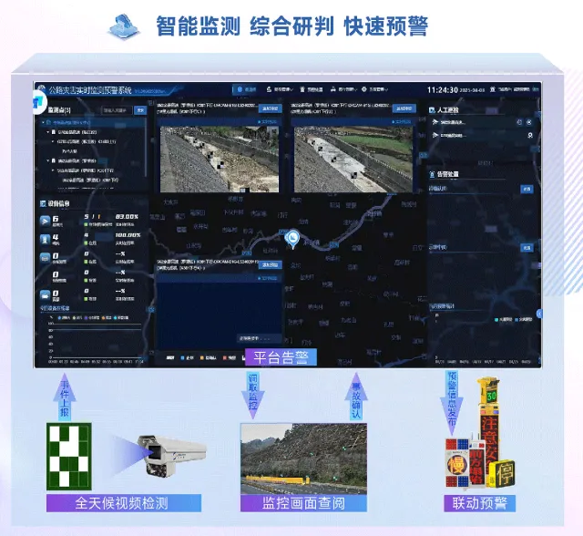 針對公路邊坡與橋梁等結構的安全隱患,信路威推出公路災害(邊坡/橋梁)預警系統(tǒng)。該系統(tǒng)采用微光靶標與超黑光AI相機,實現(xiàn)全天候精準監(jiān)測,實時感知結構形變。當系統(tǒng)檢測到異常時,立即觸發(fā)“AI監(jiān)控報警-云端確認與處置-現(xiàn)場聲光示警聯(lián)動”三級響應機制,快速提醒監(jiān)控人員處理,并聯(lián)動現(xiàn)場示警設備。通過開啟紅藍閃爍燈、高亮LED屏及語音播報等多模態(tài)預警手段,主動引導后續(xù)車輛,提示前方道路異常,有效提升行車安全。事件處置完成后,系統(tǒng)會自動生成詳細報告。