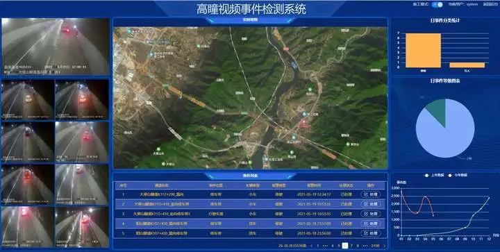 該系統(tǒng)除具備對(duì)停駛、行人、火災(zāi)、擁堵、拋灑物等多種場(chǎng)景主動(dòng)識(shí)別外,增加分析模塊和GIS地圖定位功能,優(yōu)化系統(tǒng)界面,監(jiān)控員可在系統(tǒng)界面中直觀、快速掌握當(dāng)前整體事件情況、定位事件位置,以便及時(shí)采取預(yù)警和處置措施。