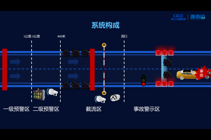 系統(tǒng)按距隧道洞口的距離由遠(yuǎn)到近設(shè)置一、二、三、四級(jí)事故警示區(qū),分別以情報(bào)板文字一級(jí)預(yù)警、語(yǔ)音+文字二級(jí)預(yù)警、紅綠燈+洞口門架情報(bào)板+定向廣播預(yù)警+轉(zhuǎn)體欄桿封閉三級(jí)預(yù)警截流及隧道內(nèi)通行燈、彌漫式預(yù)警燈、隧道廣播等方式的四級(jí)事故警示模式,讓駕駛員從視覺(jué)、聽(tīng)覺(jué)上多方位接收預(yù)警信息。