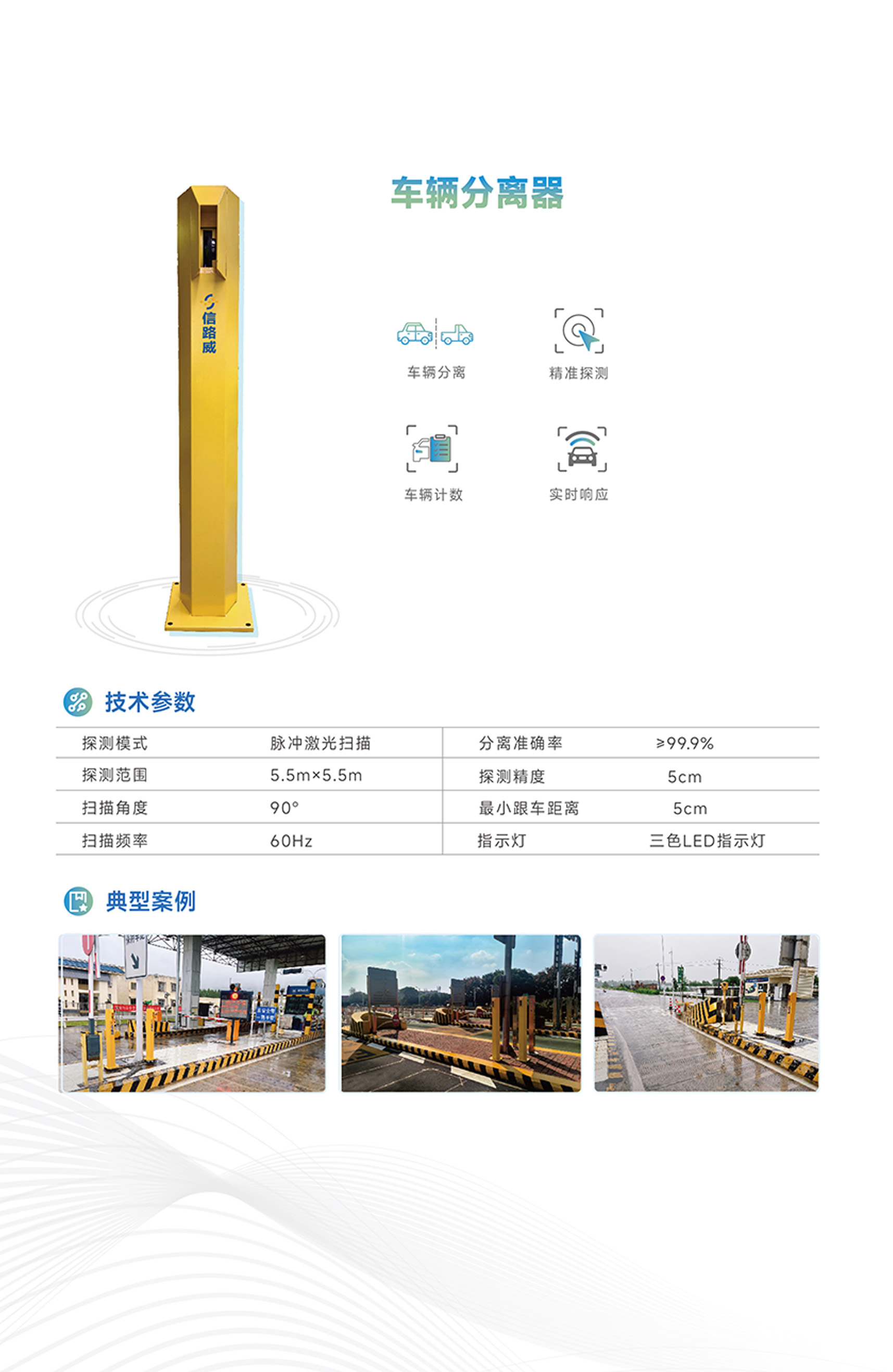 激光車輛分離器采用高頻紅外激光,集成激光發(fā)射裝置和激光接收裝置。設(shè)備基于TOF激光測(cè)距原理,通過(guò)向車道發(fā)射高頻紅外激光,實(shí)時(shí)檢測(cè)車輛通過(guò)時(shí)的距離變化,實(shí)現(xiàn)對(duì)車輛進(jìn)入時(shí)間和離開(kāi)時(shí)間的精準(zhǔn)測(cè)量,具有高精度、抗干擾、適應(yīng)性強(qiáng)等特點(diǎn),可廣泛應(yīng)用于車輛分離、車輛計(jì)數(shù)等場(chǎng)景。